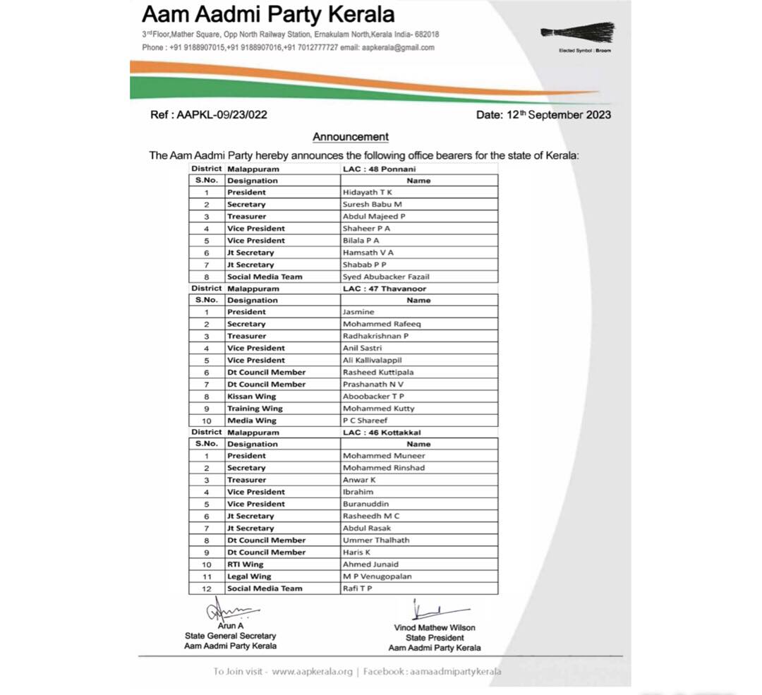 | AAP-KL/09/23/022 | Appointment of Office Bearers-LAC-043,044,045-MALAPPURAM | LAC | 12-Sep-2023 | Download | |