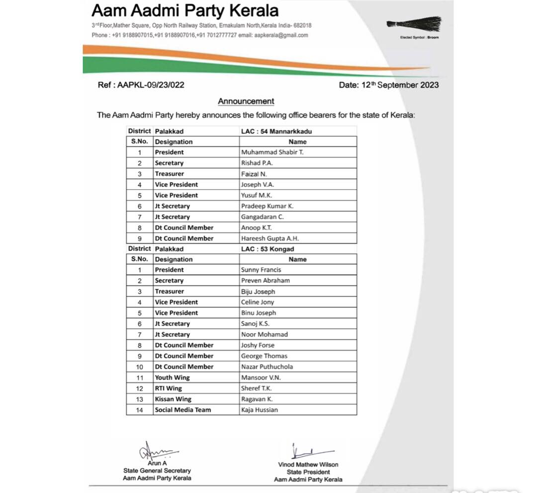 | AAP-KL/09/23/022 | Appointment of Office Bearers-LAC-053,054-PALAKKAD | LAC | 12-Sep-2023 | Download | |