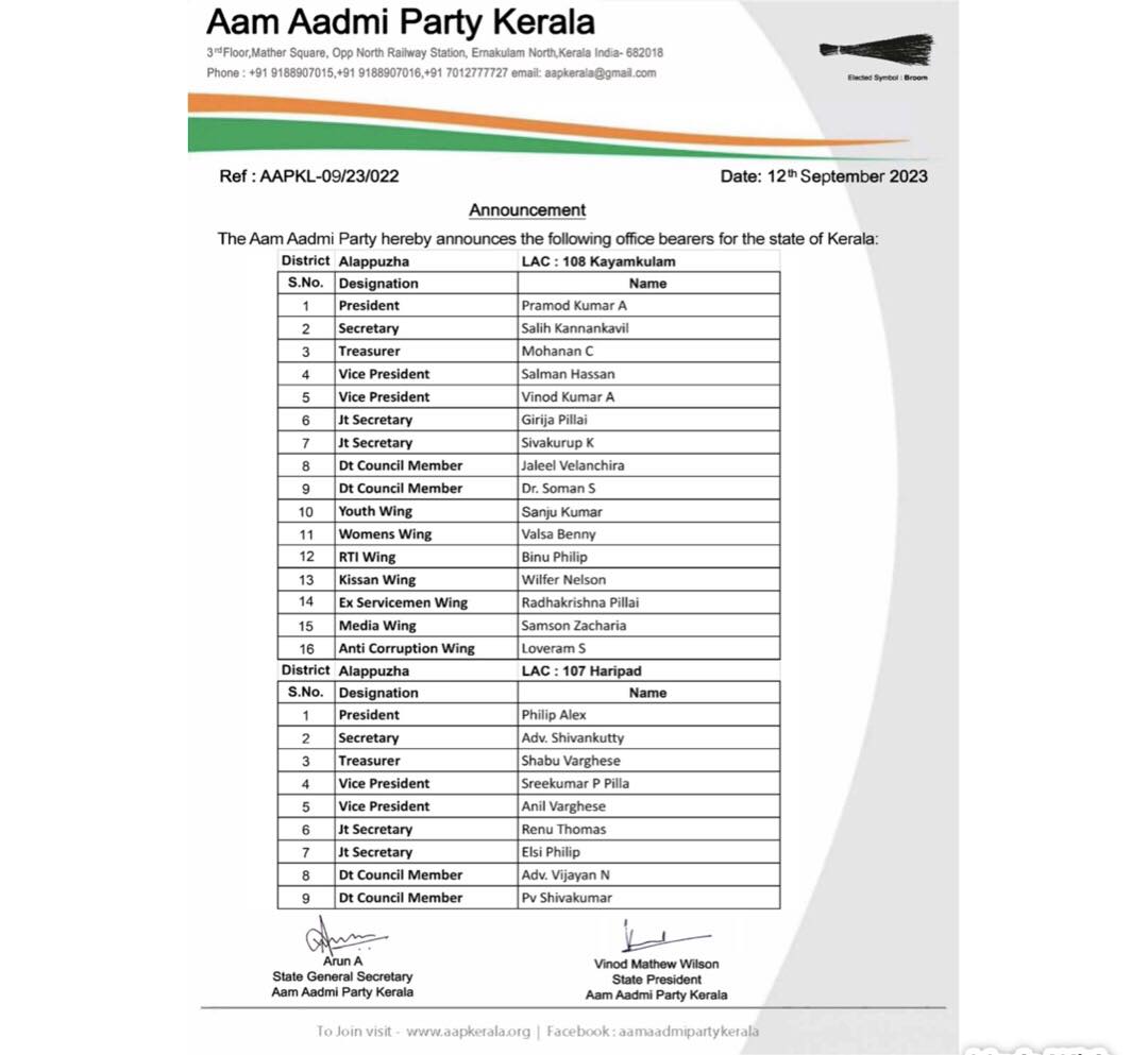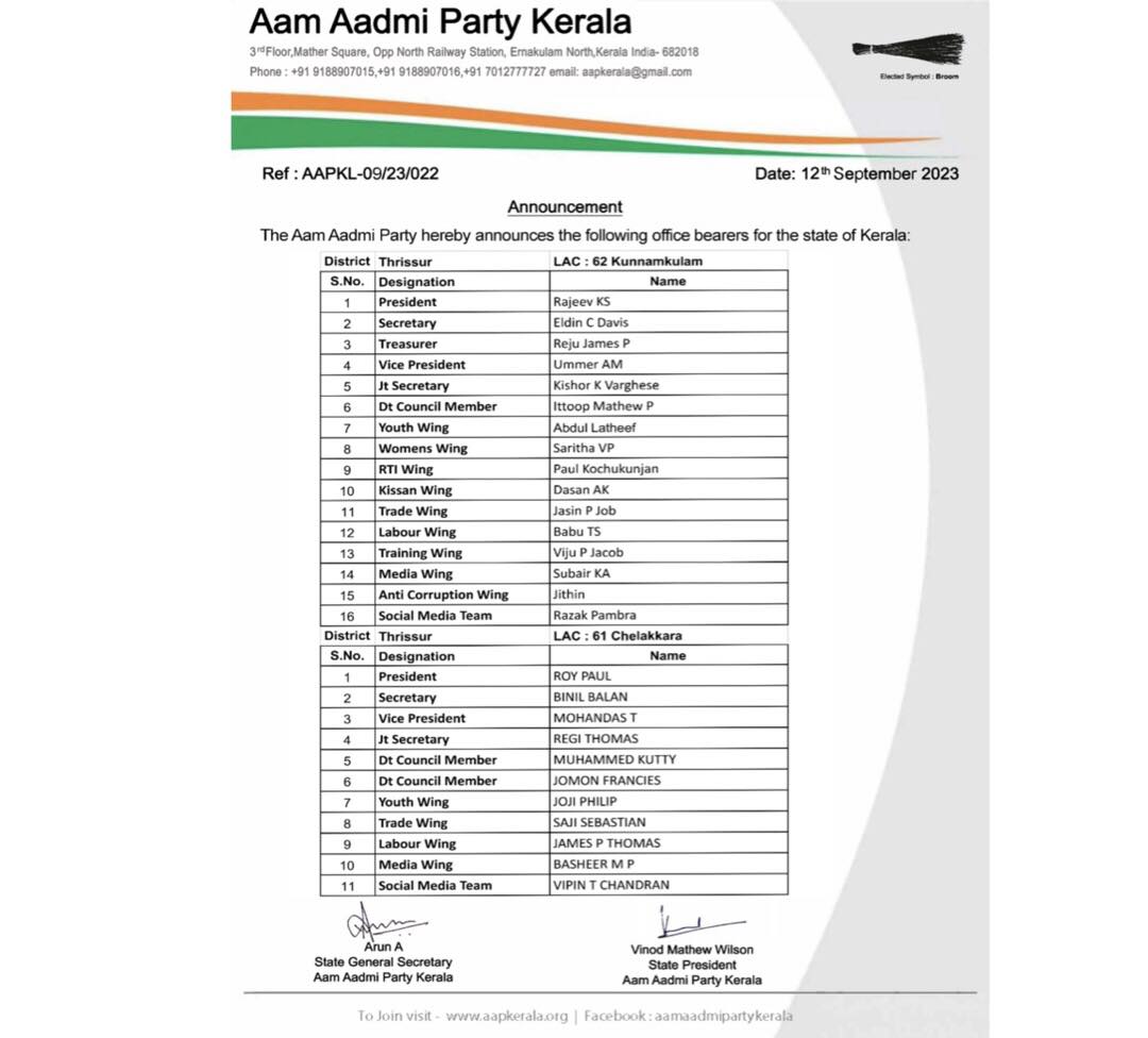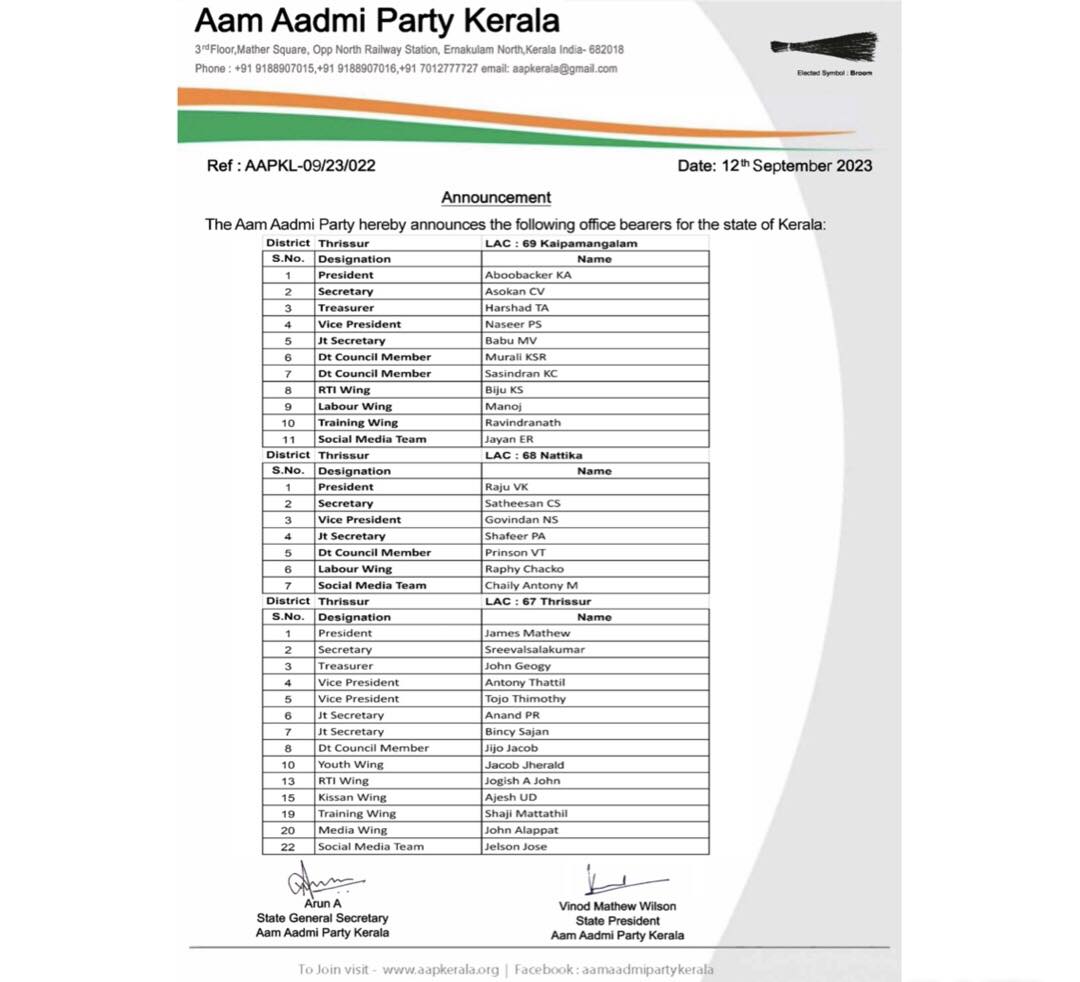 | AAP-KL/09/23/022 | Appointment of Office Bearers-LAC-061,062-THRISSSUR | LAC | 12-Sep-2023 | Download | |