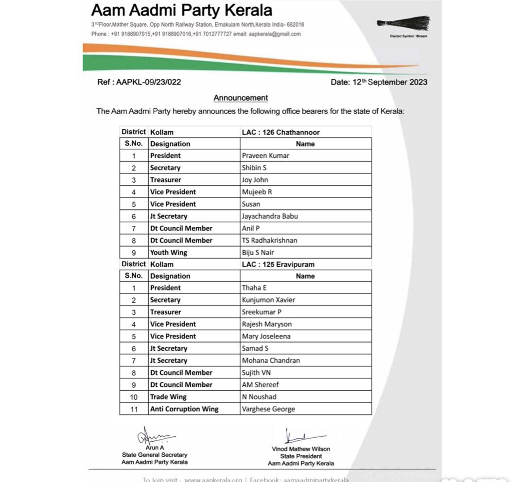 | AAP-KL-09/23/022 | Announcement of the LAC Committee in Kollam District (Chavara & Karunagappally) | LAC | 12-Sep-2023 | Download | |