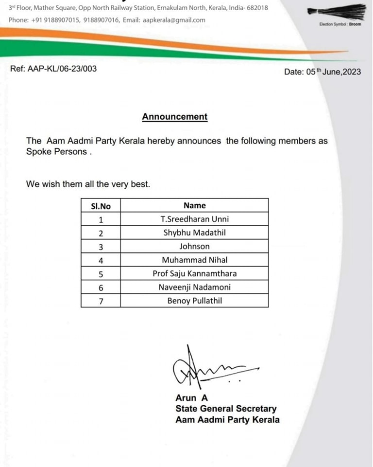 | AAP-KL/05-23/001 | General Secretary Appointment | State | 29-May-2023 | Download | |